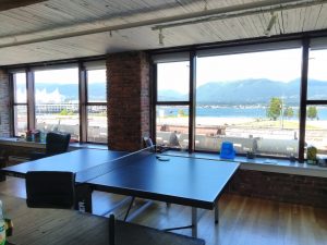 Ich wurde in den Gemeinschaftsraum des kleinen, aber wachsenden Unternehmens eingeladen. Das Büro liegt im Norden der Innenstadt und gewährt freien Blick auf die Bergkette im Norden. Ebenfalls in Sicht ist das Gebäude „Canada Place“, welches durch weiße Segel geschmückt ist und ursprünglich für die Expo ’86 eröffnet wurde. Die Ausstattung des Raums umfasst einen Esstisch, ein Sitzsofa, eine Küchenzeile und einen Tischtennistisch. Jeden Mittwoch treffen sich hier alle Kollegen zum gemeinsamen Essen. Viele der gesamt 24 Gesichter kannte ich bereits von meinem Interview am vergangenen Freitag.